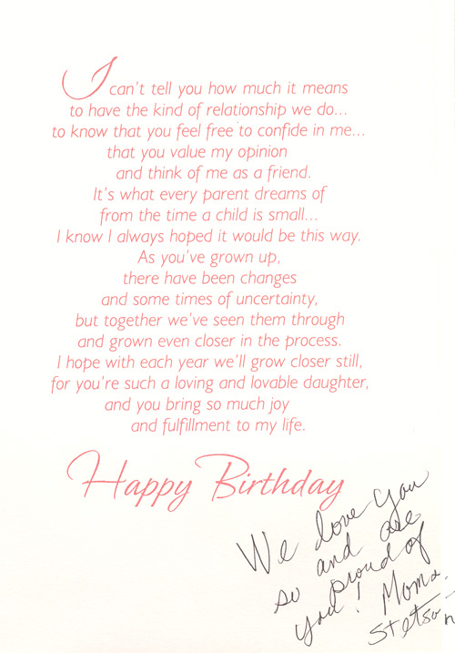 Dear Mom, I found this card when I unpacked after moving to the new house that you made possible. We have been missing you for almost a year now. I wanted to add this card to the memories. You sent it to me but I could reverse the feelings for having a mother like you. Love, Kathy |